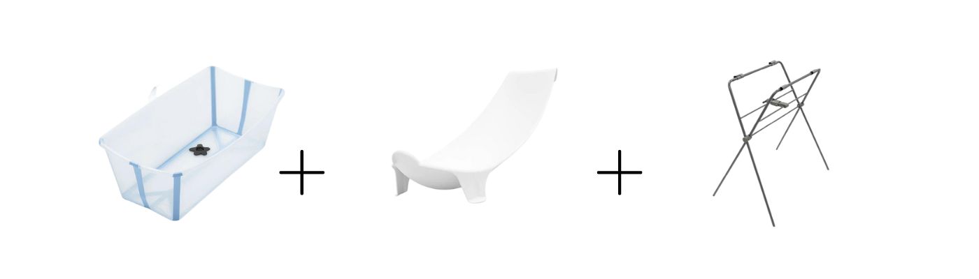 Este es tu pack ideal. Incluye una bañera plegable + un soporte y patas que elevan al bebé a una altura cómoda.